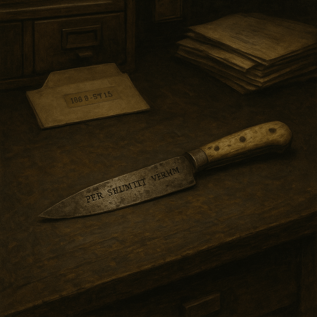 Descrizione: Lama grezza, simile a un coltello da macellaio, con incisioni latine parzialmente decifrate (“Per silenti veritate”).