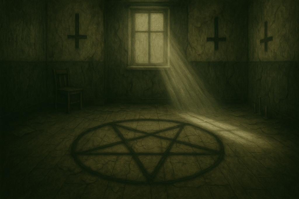 Un letto sfatto, un crocifisso rovesciato, una sedia capovolta.