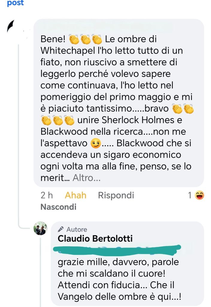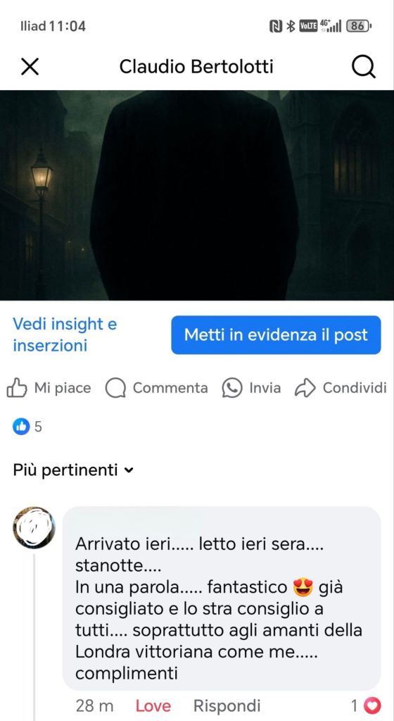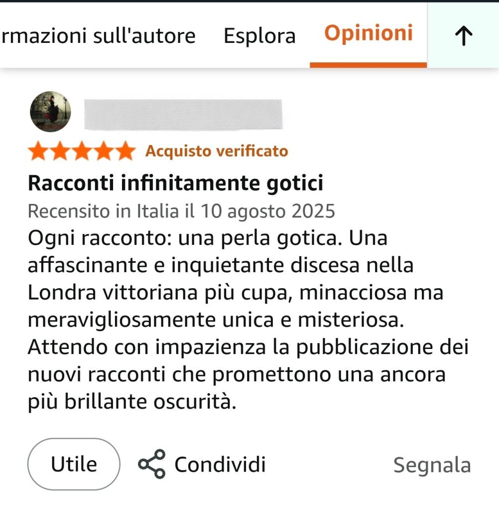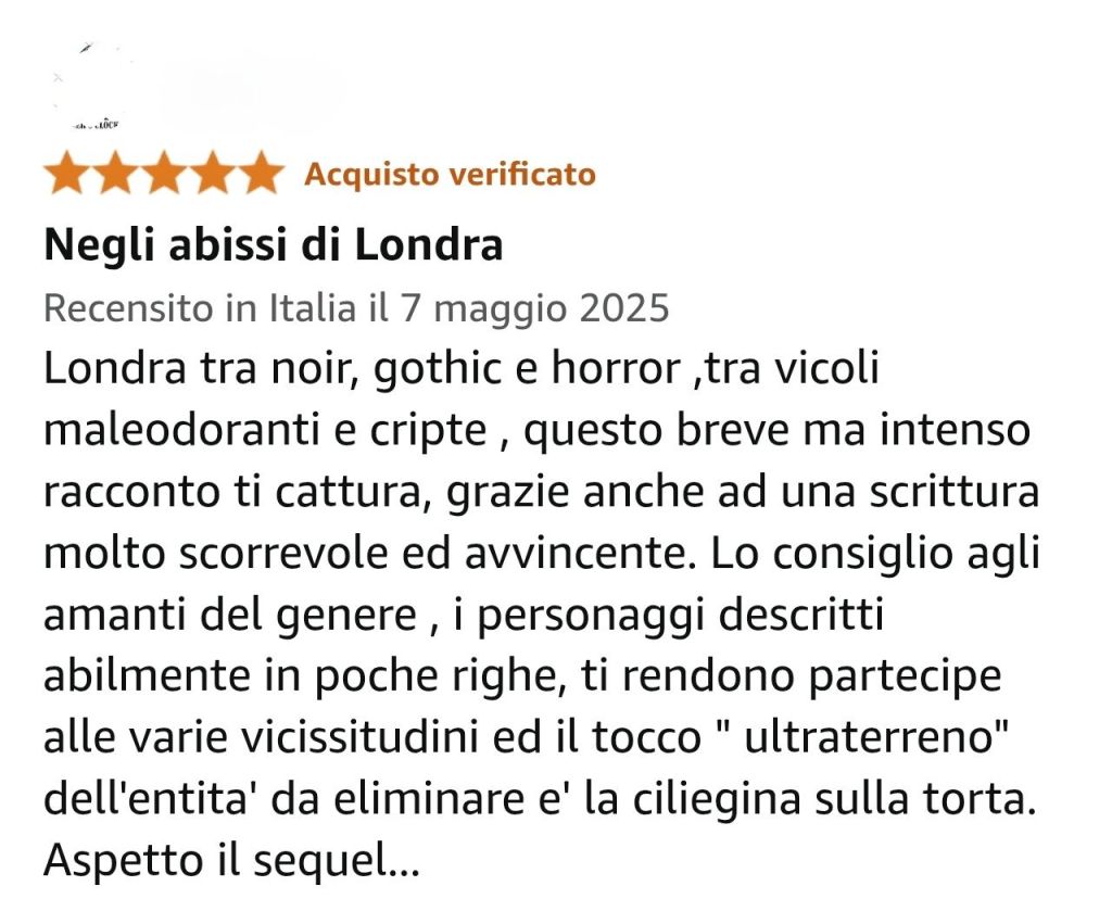 Una nuova, entusiasta recensione a 5 stelle su Amazon premia Le Ombre di Whitechapel per la sua atmosfera gotica, l’intensità narrativa e i personaggi vividi. Il lettore lo definisce “scorrevole e avvincente” e attende già il seguito. Un grazie sincero a chi sta sostenendo il nostro viaggio tra nebbia e mistero!