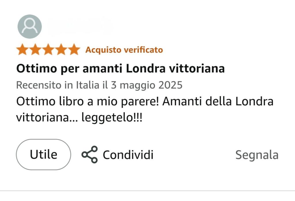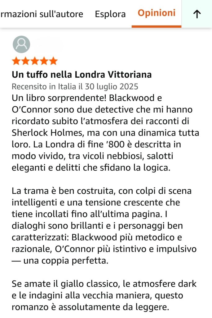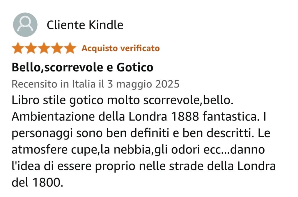 Un lettore appassionato di Londra vittoriana ha definito Le Ombre di Whitechapel un racconto imperdibile, da consigliare a chiunque ami mistero, atmosfera e intensità narrativa.