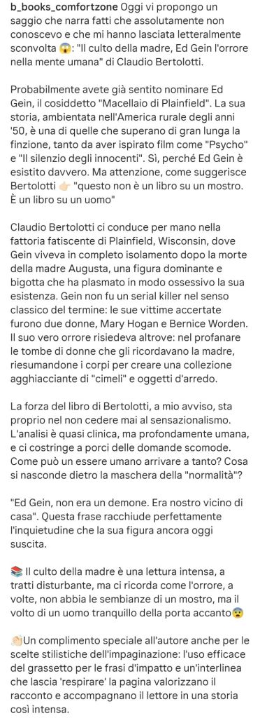 Una delle più belle recensioni ricevute per Il Culto della Madre – Ed Gein e l’orrore nella mente umana