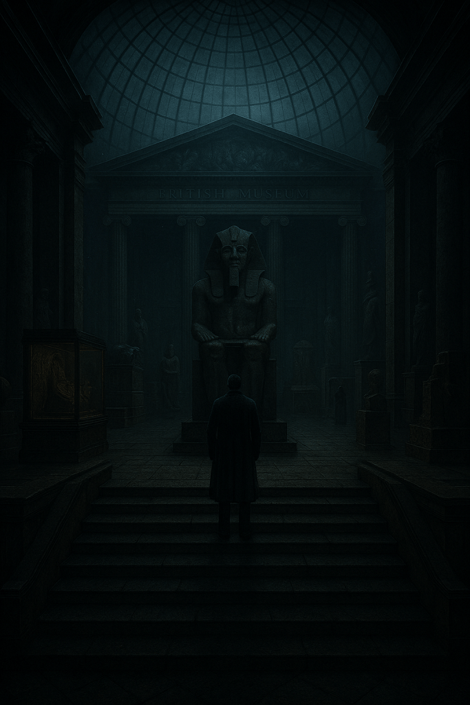 Poi, eccolo. Il British Museum si alza davanti a me come un tempio di pietra e memoria. Colonne greche che sfidano il cielo plumbeo, scalinate fredde su cui le ombre si attorcigliano pigre, come se attendessero di inghiottire chi entra.